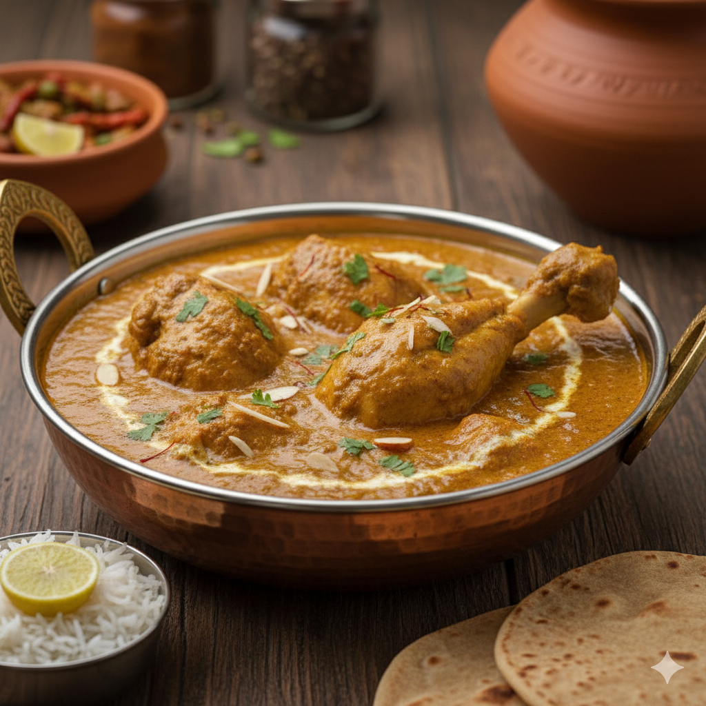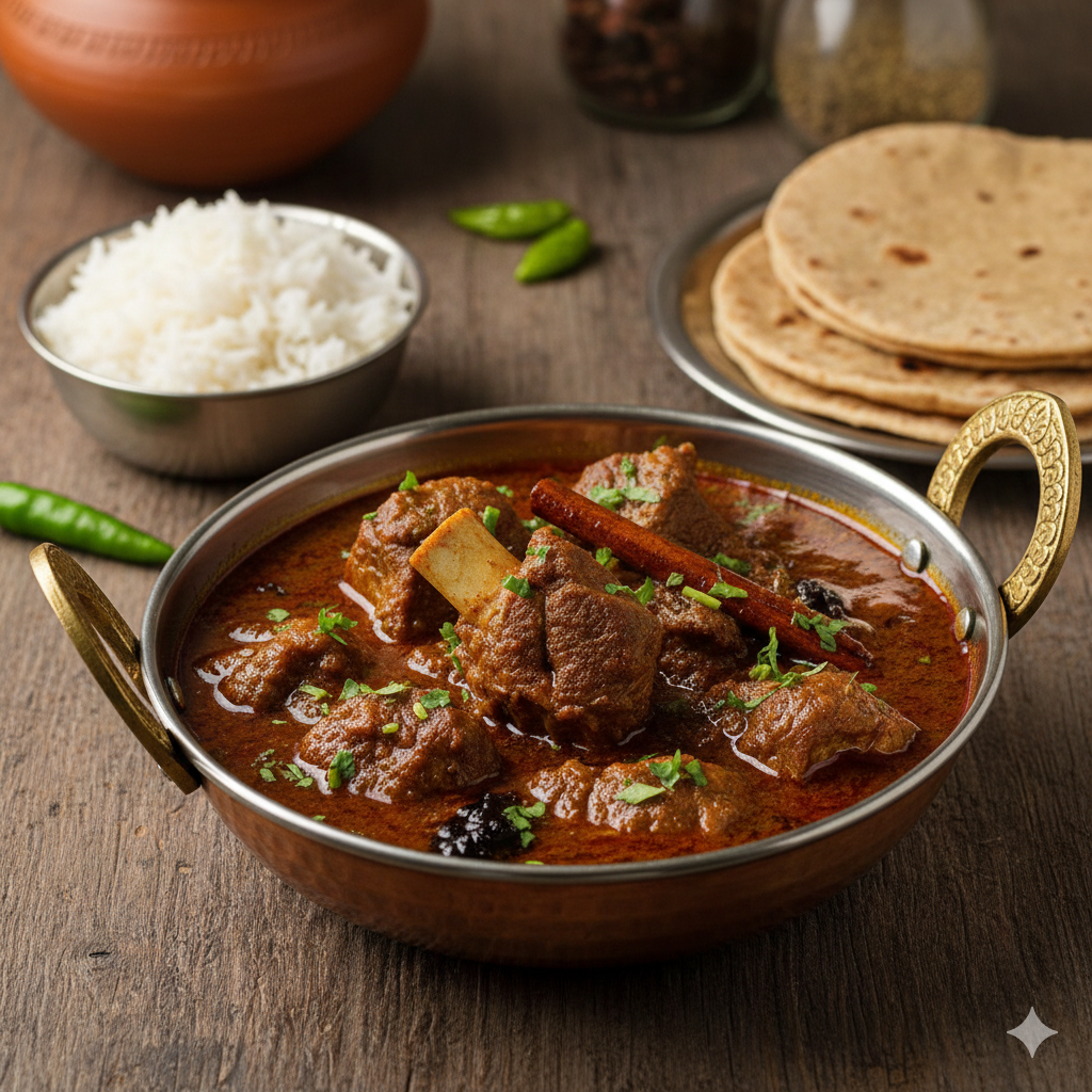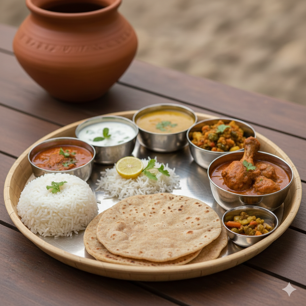 Rotis, rice, dal, sabji, chicken/mutton curry, raita, and pickle
